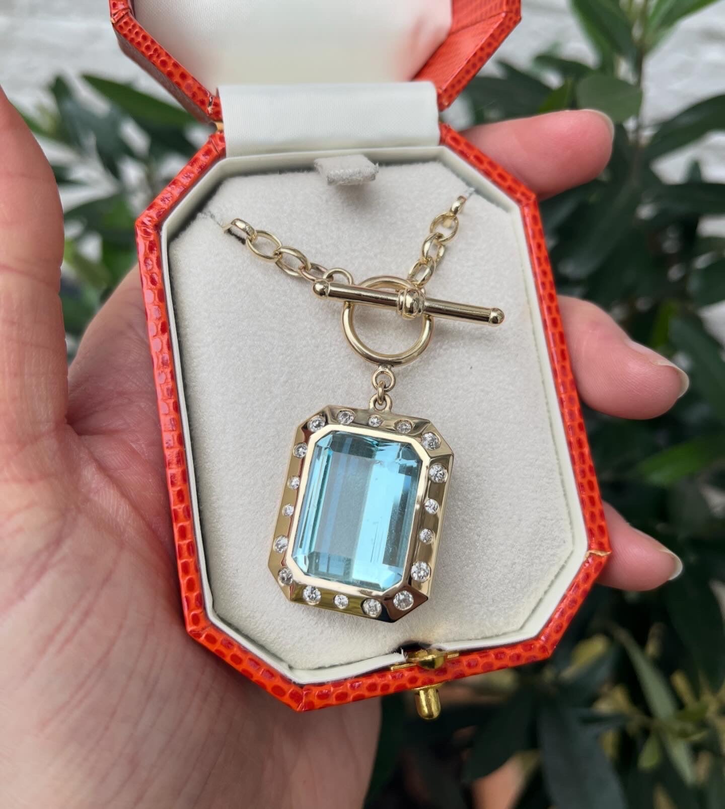 An 11.06 carat Aquamarine from a pre-loved cocktail ring surrounded by old-cut diamonds from an heirloom ring set into a handmade 9 carat gold pendant suspended from a Serena Ansell Signature T-bar necklace.