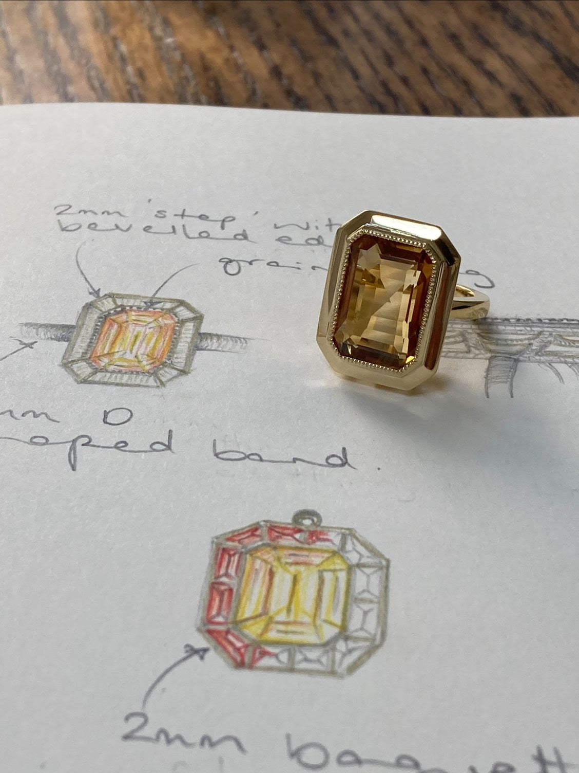 A client’s 32.08 carat Citrine brought back from Sri Lanka with the romantic intention to set it into a cocktail ring for his wife. We used baguette diamonds from a preloved eternity ring and combined them with black spinels to create this handmade, 18 carat gold Art-Deco inspired beauty.