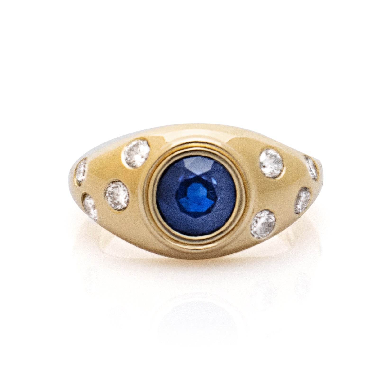 A round blue Sapphire and Diamonds from a client’s pre-loved cluster ring redesigned into a ‘Starry Night’ bombé ring