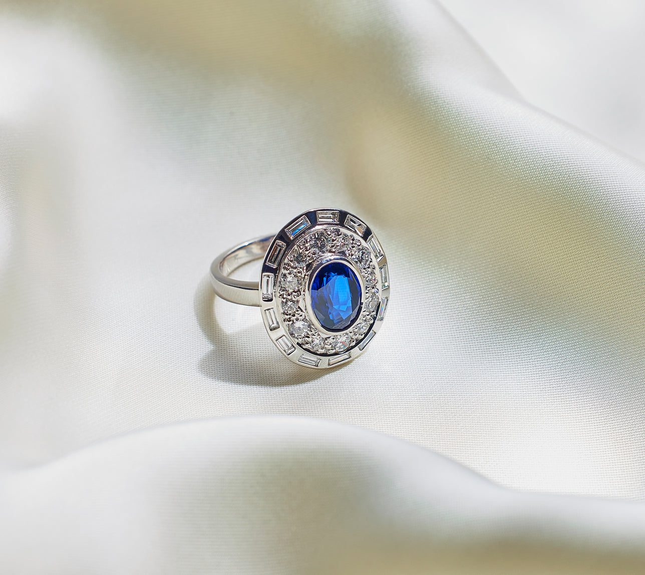 A bespoke blue Sapphire and Diamond ring made using a client's Grandmother's Sapphire and accompanying it with two baguette Diamonds and two round brilliant Diamonds set in an 18 carat gold ring