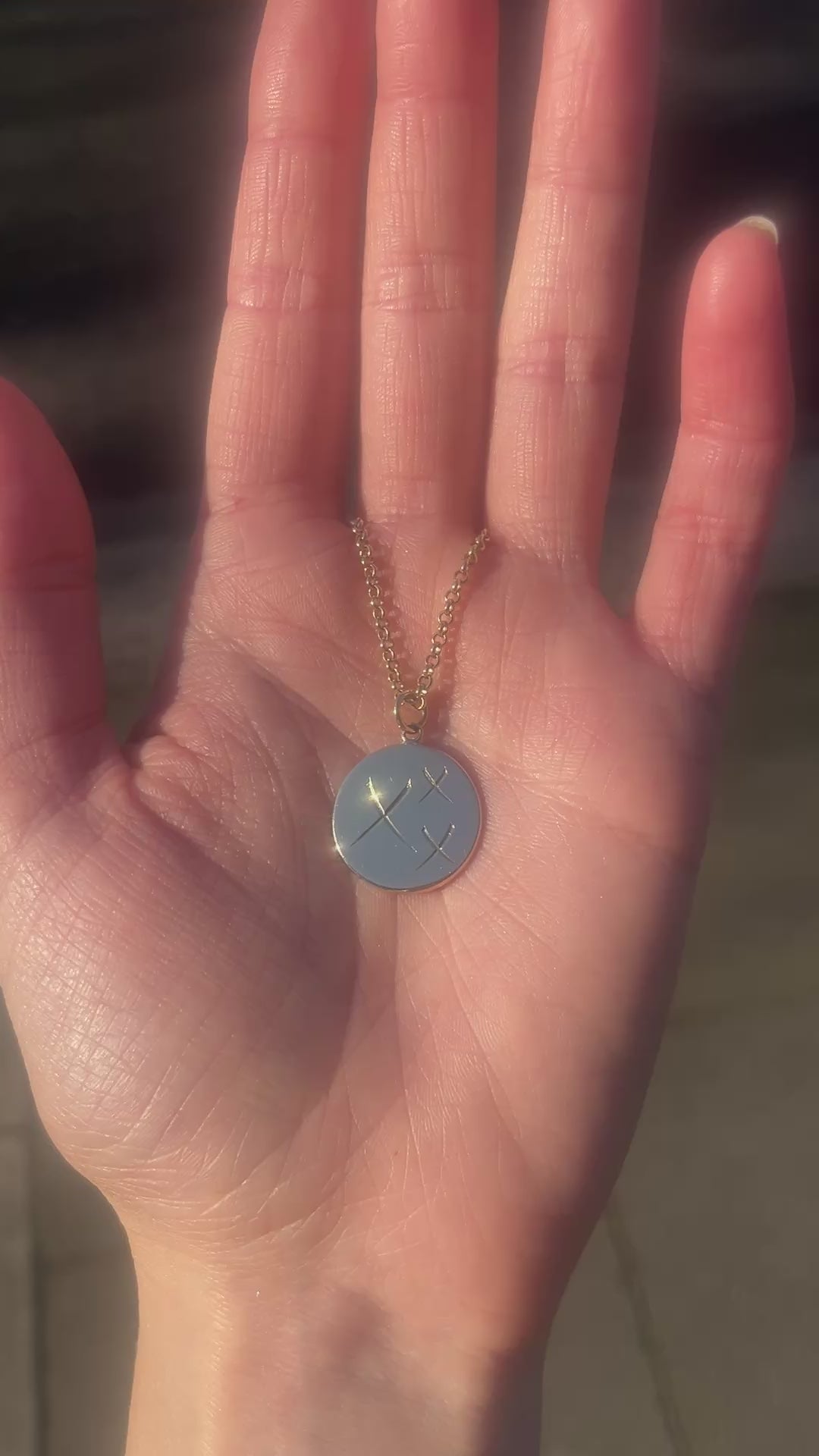 A solid 9 carat gold disc pendant lovingly hand-engraved with a trio of Xs.