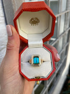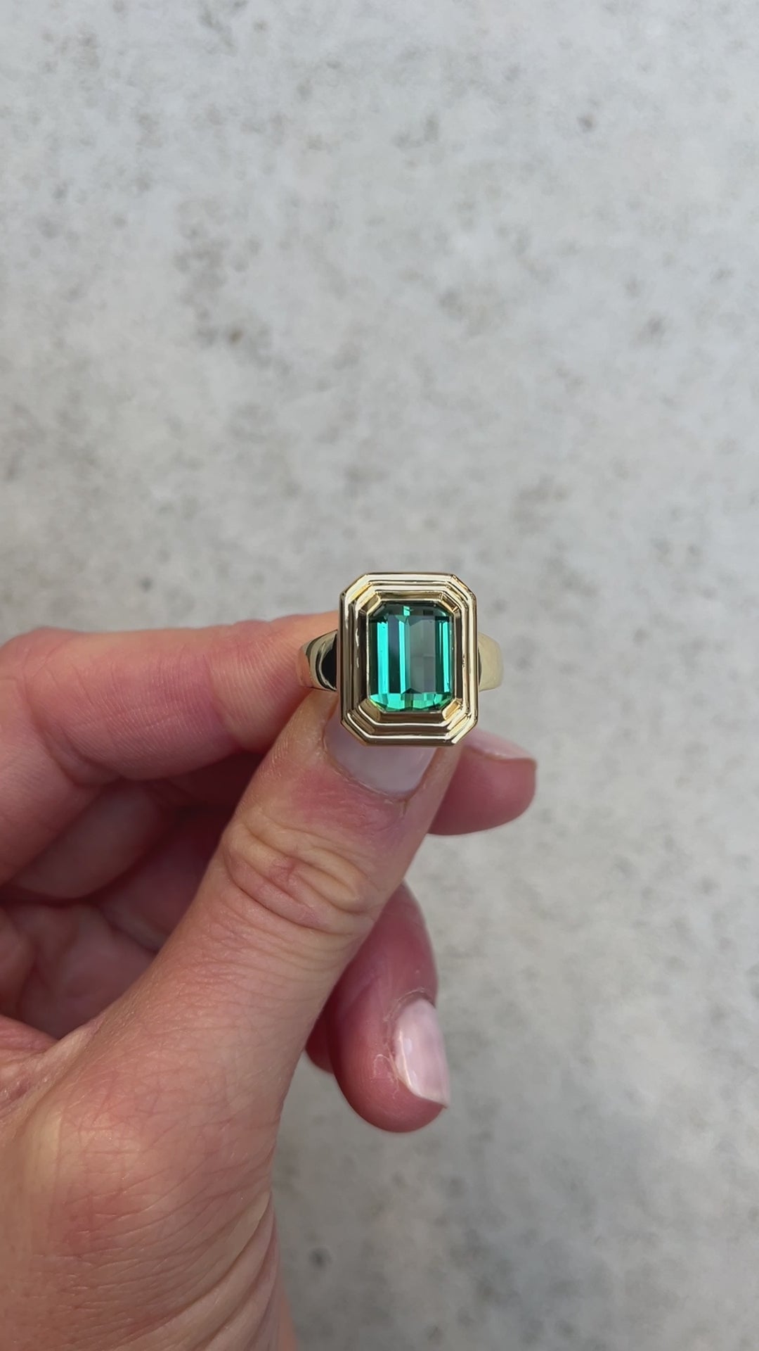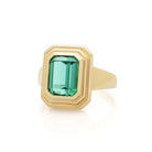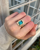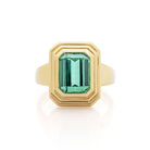An emerald-cut Teal Tourmaline Ripple Ring.